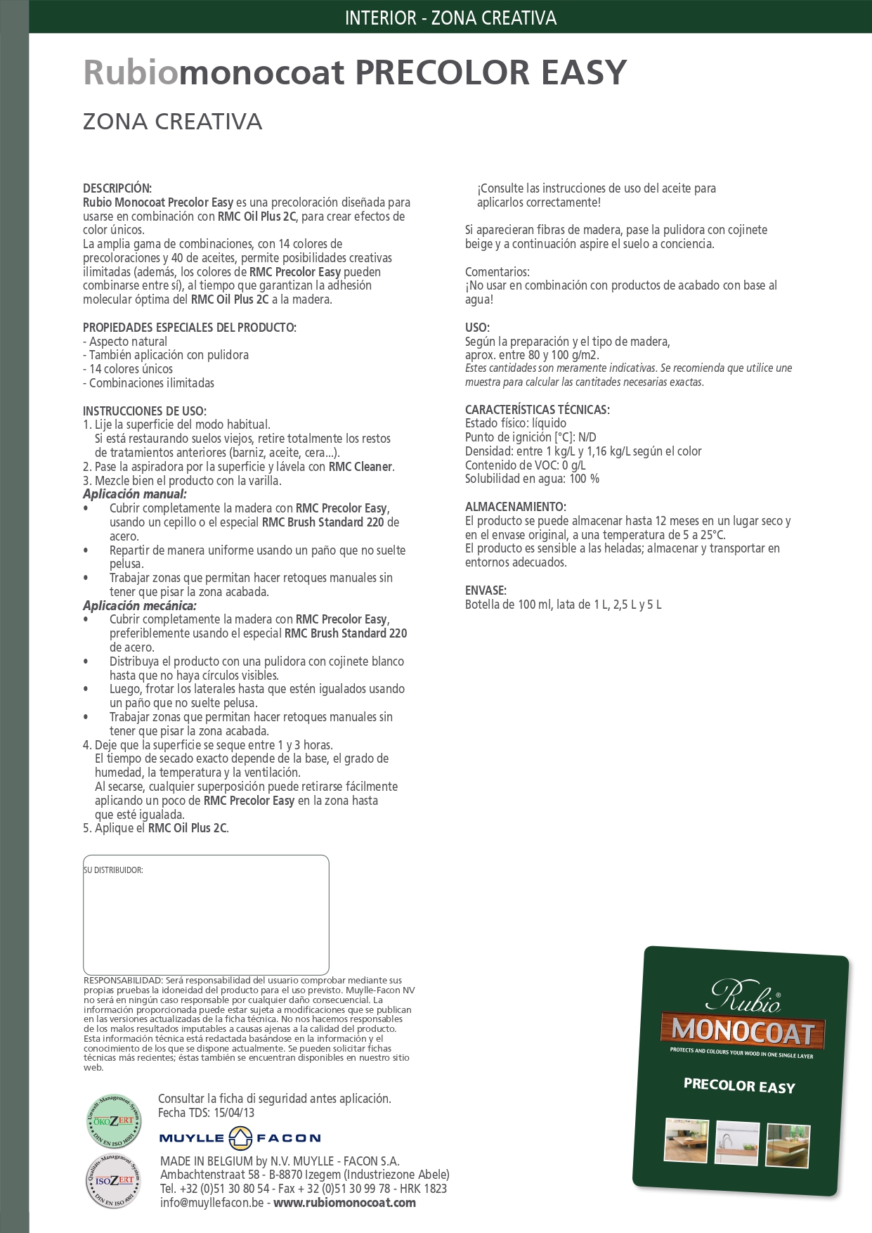 A ampla gama de combinações, com 14 cores de pré-color e 40 de óleo, permite possibilidades criativas ilimitadas (além que as cores de RMC Precolor Easy podem ser combinadas entre si),ao mesmo tempo que garantem uma perfeita adesão molecular do RMC Oil Plus à madeira.
