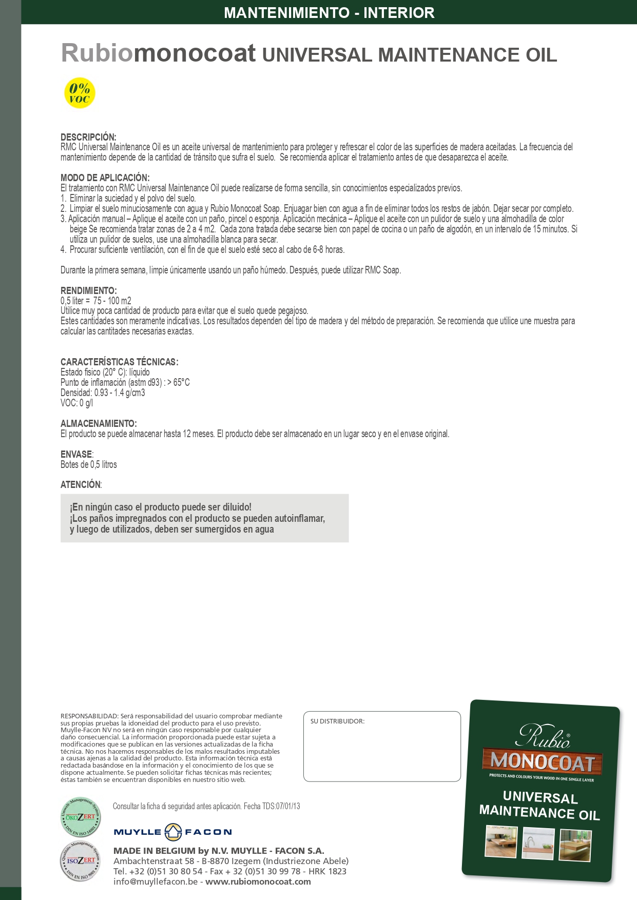 Rubio Monocoat Maintenance Oil é um produto pronto a utilizar, desenvolvido para o cuidado da madeira com o acabamento do óleo da Rubio Monocoat. Este tratamento restaura tanto a intensidade da cor como a proteção. A frequência de aplicação deste tratamento depende da intensidade de utilização.
